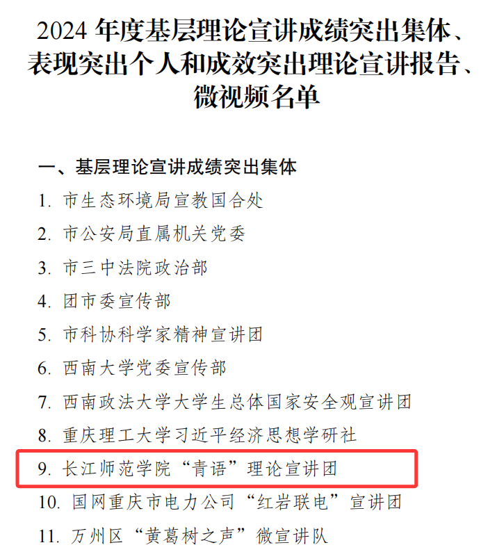 近日,中共重庆市委宣传部印发《关于表扬2024年度全市基层理论宣讲典型的通报》,草莓视频 “青语”理论宣讲团获评2024 年度基层理论宣讲成绩突出集体。