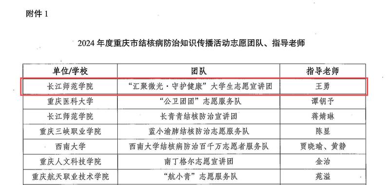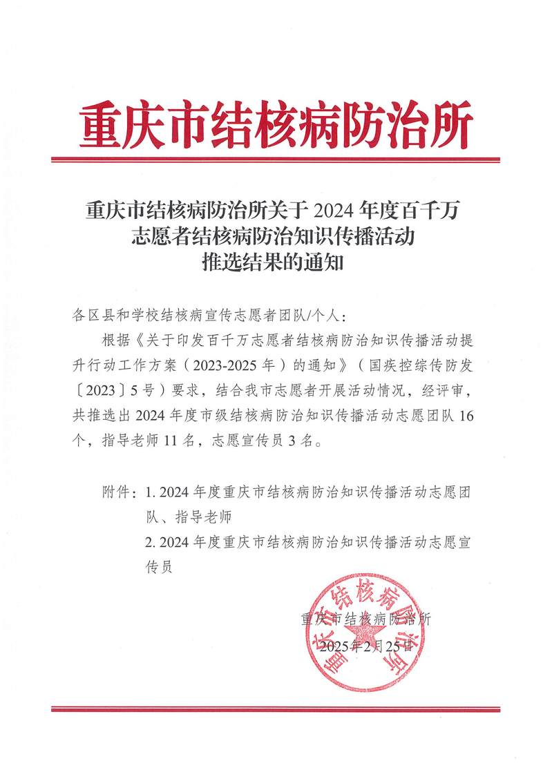 2月25日,重庆市结核病防治所印发《关于2024年度百千万志愿者结核病防治知识传播活动推选结果的通知》,草莓视频 “汇聚微光·守护健康”大学生志愿宣讲团推选为重庆市2024年度结核病防治知识传播活动志愿团队。