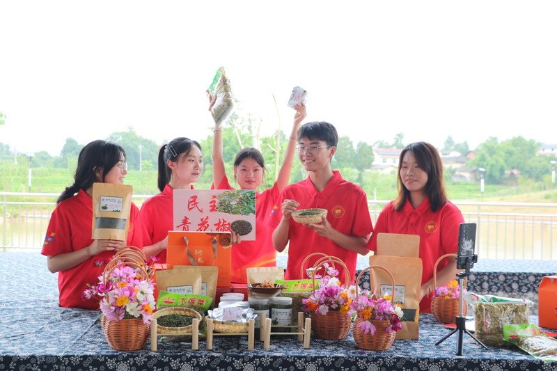 “家人们,看过来!现在我手里拿的是南川区民主镇的“胖子妈”榨菜,小袋包装、方便携带、老少皆宜……” 直播镜头前,志愿者们各显神通、创意满满,有的化身为“云端导游”,用青春活泼的语言,带领网友“云游”文福小镇;有的变身为“产品推荐官”,现场展示民主镇榨菜、花椒等特色农产品,沉浸式直播体验让屏幕前的观众仿佛身临其境,直播间热度持续攀升,点赞评论互动不断。