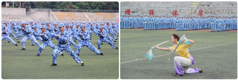 大会在雄壮的国歌声中拉开帷。伴随着激昂的军乐,参训新生带来了一场气势恢宏的表演:分列式方队步伐铿锵、队列严整,从齐步走的稳健到正步走的昂扬,每一个动作都凝聚着数日反复打磨的心血。武术、军体拳、匕首操表演将大会气氛推向高潮,同学们动作刚劲有力、干净利落,招式标准到位,眼神坚定刚毅,整套动作一气呵成,气势如虹,赢得现场师生阵阵掌声。