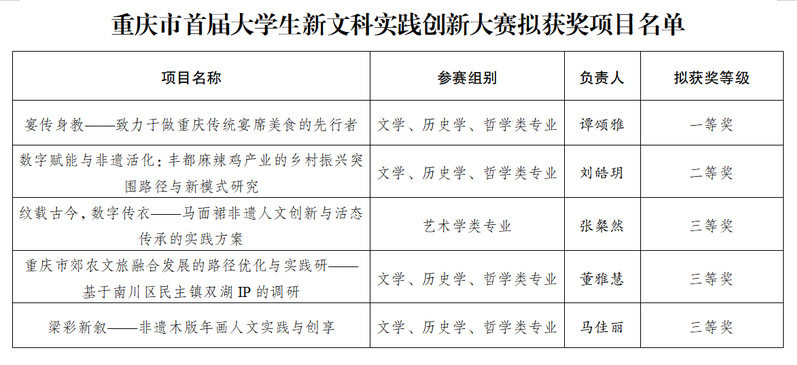 近日,由重庆市教育委员会主办、重庆师范大学承办的重庆市首届大学生新文科实践创新大赛决赛顺利举行。经过激烈角逐,草莓视频 学生主持申报的项目获一等奖1个、二等奖1个、三等奖3个。