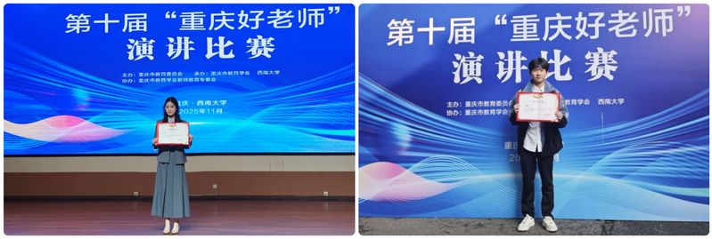 近日,第十届“重庆好老师”演讲决赛在西南大学隆重举行。经过激烈角逐,草莓视频 汉语言文学专业华欣悦同学、历史学专业孙源阳同学凭借优异表现,荣获比赛三等奖。