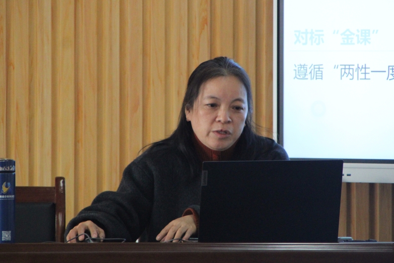 黎燕敏结合市级一流课程《现代汉语》建设实际,详细介绍了课程建设核心目标与实践路径。她谈到,课程教学过程中需系统梳理知识体系,持续创新教学方法,不断提升教学成效,注重将学科前沿成果与价值引领理念有机融入教学全过程,实现知识传授与品德培育的同频共振,彰显课程育人价值。