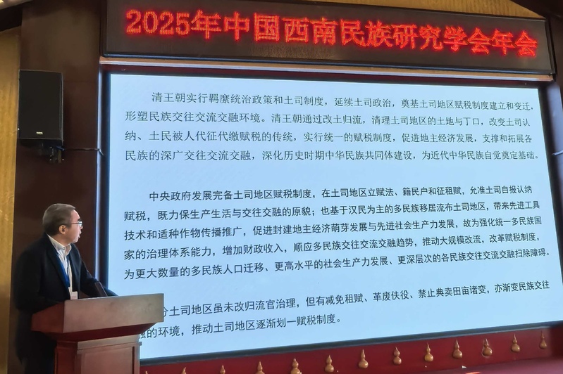 期间,彭福荣围绕《清代改流前后土司地区赋制变迁与民族交往交流交融探微》研究成果作了主旨发言,结合清代土司地区改土归流与各民族交往交流交融的紧密关联,认为中华民族共同体视角应是清代土司地区赋税制度研究的可行维度。在主持“铸牢中华民族共同体意识研究”分论坛期间,彭福荣指出,以国家战略视野精准选定研究场景、系统融通多学科理论与方法、开展扎实深入的调查研究,是深化西南民族历史文化研究、铸牢中华民族共同体意识的重要路径。此外,彭福荣还参加了“基层专家行”活动,和专家学者考察调研中缅口岸和沿边村寨,实地感受边地各民族爱国巡边与铸牢中华民族共同体意识,重温边境老支书们与国家领导人的往来书信。