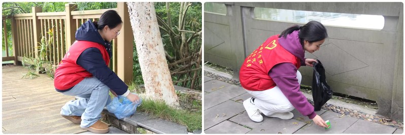 在学校鉴湖环路,志愿者们手拿夹钳、垃圾袋,仔细清理湖边矿泉水瓶、塑料袋、泡沫塑料、易拉罐、烟头等废弃垃圾,按照垃圾分类标准进行投放,充分展现出青年学生热情奉献、团结合作的精神风貌。经过志愿者们的共同努力,校园环境焕然一新。