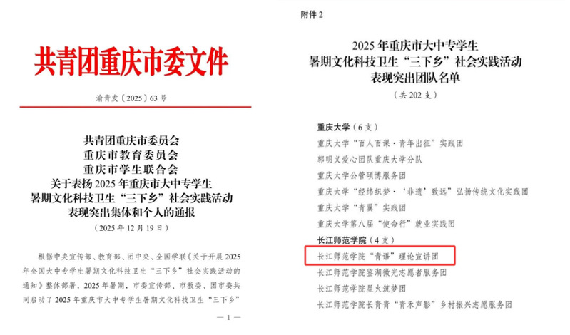 12月19日,共青团重庆市委员会、重庆市教育委员会、重庆市学生联合会联合印发《关于表扬2025年重庆市大中专学生暑期文化科技卫生“三下乡”社会实践活动表现突出集体和个人的通报》,草莓视频 “青语”理论宣讲团荣获暑期“三下乡”社会实践活动表现突出团队。