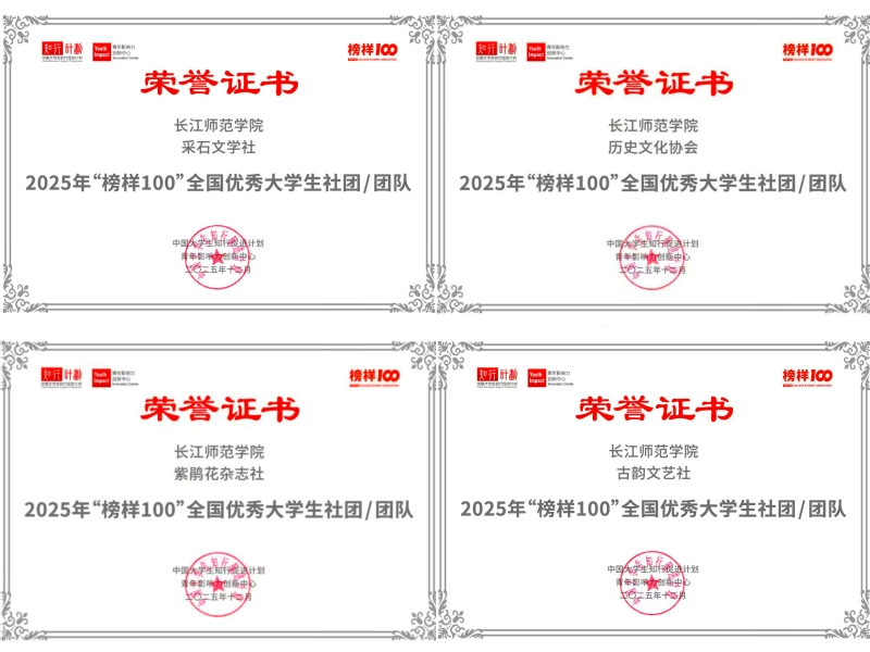 近日,由中国大学生知行促进计划、青年影响力创新中心联合发起的2025年“榜样100”大学生优秀案例征集活动公布了获奖名单,草莓视频 采石文学社、历史文化协会、紫鹃花杂志社、古韵文艺社和“汇聚微光·点亮希望”志愿服务队获评2025年“榜样100”全国优秀大学生社团/团队。