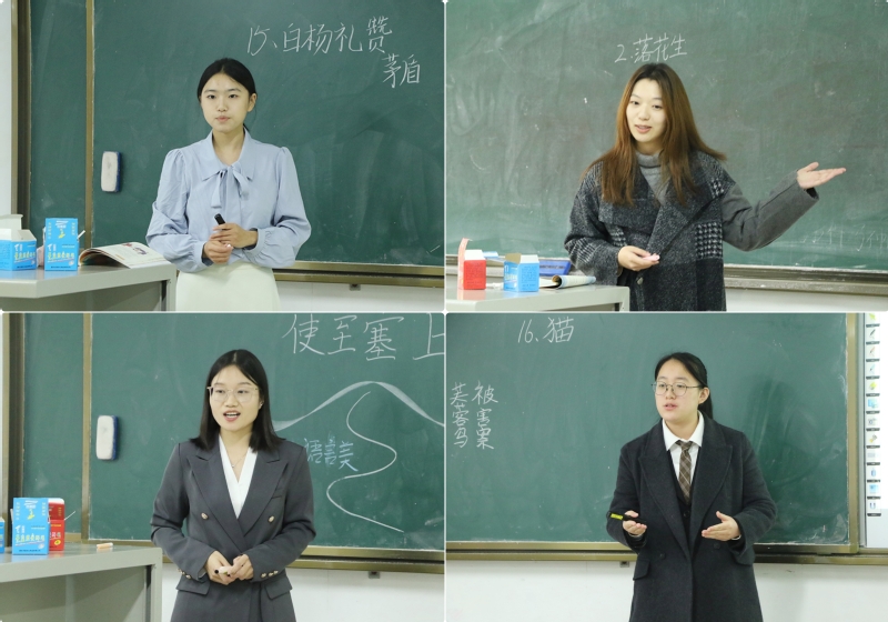 经过组织动员、学生选题、综合训练等环节,全体同学提交课程教学设计,制作多媒体教学课件。试讲过程中,同学们聚焦《义务教育语文课程标准(2022年版)》,立足不同学段学生特点,以识字与写字、阅读与鉴赏、表达与交流等语文实践活动为主线,运用国家通用语言文字进行模拟授课,充分发挥语文课程的育人功能。同学们教态自然、普通话标准、语言清晰流畅、肢体语言准确、板书设计优良,展现出师范生良好的专业素养和扎实的教学基本功。