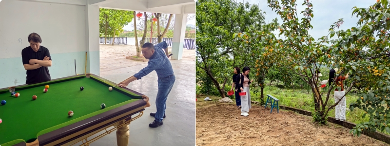 春日的田园生机盎然,青山叠翠、樱红满枝,空气中弥漫着清新果香,为本次踏青活动营造了惬意氛围。活动设置樱桃采摘、台球、垂钓、羽毛球、乒乓球等趣味项目,满足不同教职工的兴趣需求。在樱桃采摘园,翠绿枝叶间挂满晶莹饱满、色泽红润的樱桃,老师们提着果篮穿梭于林间,亲手采摘、品尝鲜果,分享劳动喜悦,在田园野趣中感受春日馈赠,尽享自然之乐。运动场上,老师们活力尽显、各展风采;台球桌前,大家凝神专注、精准推杆,在切磋技艺中增进交流、舒缓压力。活动现场,既有竞技的热烈,也有休闲的静谧,处处洋溢着团结友爱、轻松愉悦的氛围,老师们或结伴竞技、或围坐畅谈、或合影留念,定格下春日里的美好瞬间。